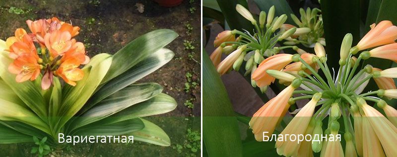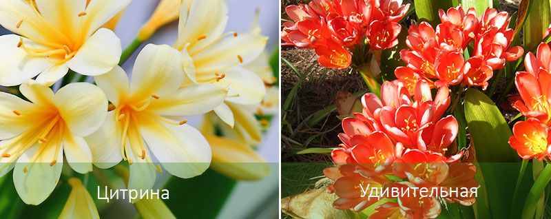 - Clivia miniata (цинобър) е най-разпространеният сорт; един дръжка може да носи от 15 до 20 оранжево-червени съцветия; цъфтежът е през февруари-март.