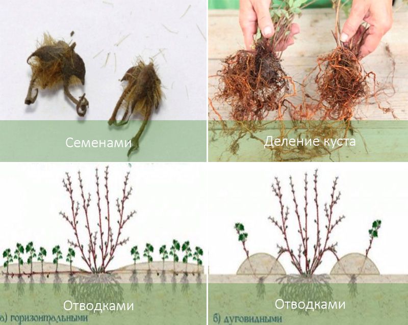 Можете да използвате разделянето като метод за размножаване, като презасадите целия разсад. Храстът се изважда от земята и се оглежда, като се отстраняват всички изгнили корени. След това се разделя на части, като се гарантира, че всяка част има силен корен и добре развито стъбло. Разрезите трябва да се запечатат с дървени въглища, за да се предотврати навлизането на микроби и кореновото гниене. Подготвените храсти се засаждат в траншеи или дупки.