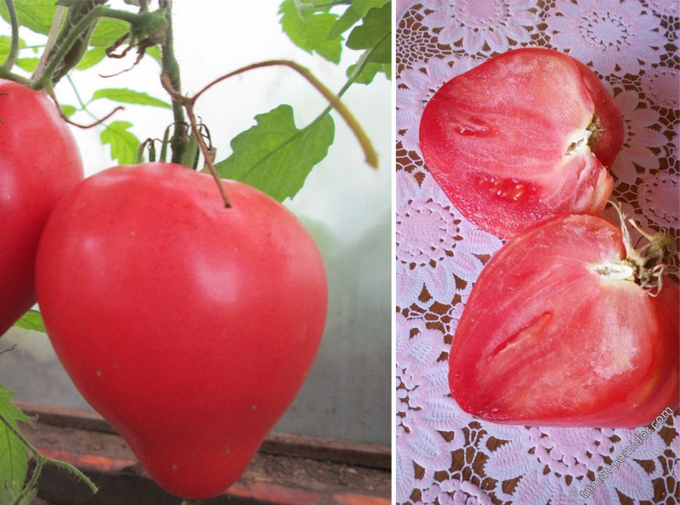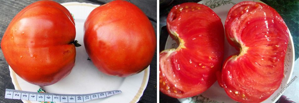 Този сорт е разработен чрез народна селекция. Доматите със сърцевидна форма тежат 900 г. Плодовете, разположени на долните гроздове, могат да достигнат още по-големи размери.