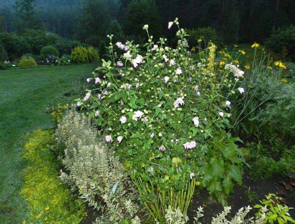 Храстът е много буен, висок и покрит с розови цветове. Между другото, снимката в темата за хибискус/слез изглежда точно като многогодишна лаватера.