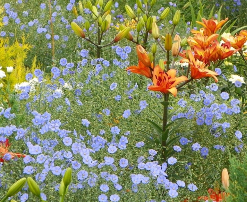 Понякога ленът се засажда заедно с рози; той ефектно украсява основата на растенията.