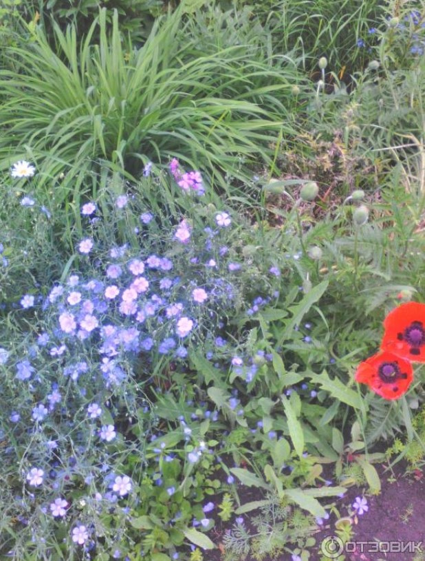 По същата причина се извинявам за плевелите; просто нямам възможност да ги изкореня всичките, предвид безкрайните поройни дъждове.Многогодишните ленени семена „Син килим“ ни струваха петнадесет рубли.