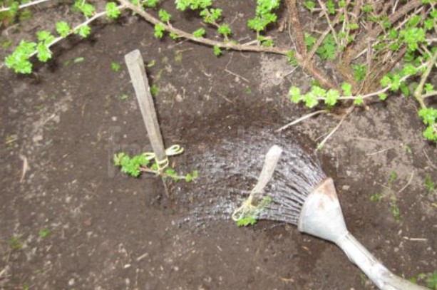 - Наслояване. Използват се недървесни зелени издънки на възраст 2-3 години. Тази процедура се извършва през есента. Клонът се огъва към земята и се закрепва на разстояние 20-30 см от върха. Тази област се покрива с плодородна почва или хумус и се навлажнява. Ако всичко е направено правилно, до пролетта трябва да се появи нов слой.