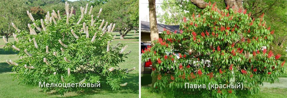 | дребноцветни | Храстовидно растение, произхождащо от Съединените щати. Височина до 4 м, ширина 4-5 м. | Голям (до 22 см дължина), петделен, светлозелен, пожълтява през есента. |