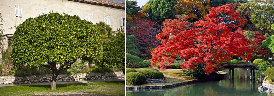 Широколистните дървета са от съществено значение за градинските композиции. Структурата им се различава през зимата и лятото.