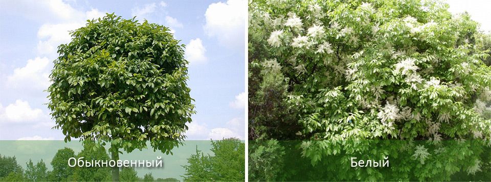 | Бяло | Непретенциозен, понася добре както жегата, така и студа. Има широка, леко заоблена корона. | Младите дървета приличат на кленови дървета, като по-късно придобиват яйцевидна форма. Те са гъсти, с дълги дръжки. |
