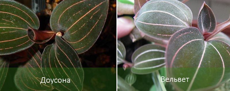 Големите, кадифени листа са разположени в розетки. Цветът им варира от тъмнозелено до бордо, а повърхността е украсена с шарка от сребристи или червеникави жилки. Те достигат 7 см дължина и 4 см ширина.