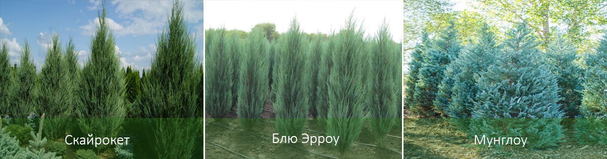 | Мофат Блу | Синьо-зелен на цвят, широкопирамидална форма. Максимална височина 6 м, ширина 1,5 м. |