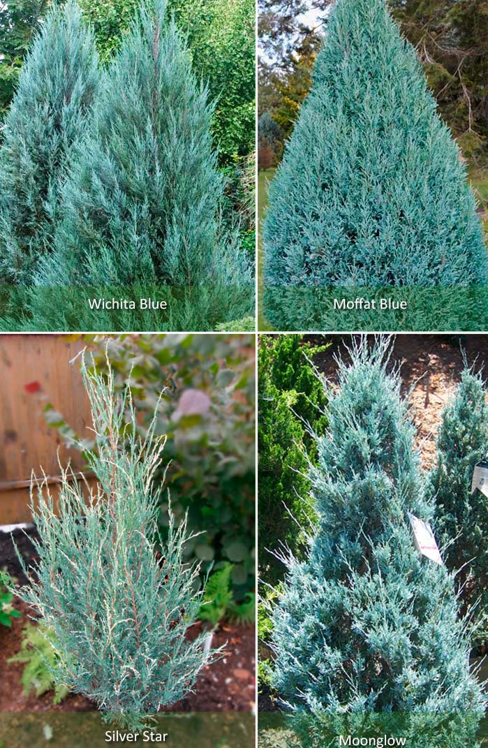 | Уишита Блу | Бързорастящо. На 3-годишна възраст е високо 1,5 м; на 0-годишна възраст е 2 х 0,8 м; по-късно расте до 7 х 3 м. Обича пълно слънце. Има синкав цвят както през зимата, така и през лятото. |