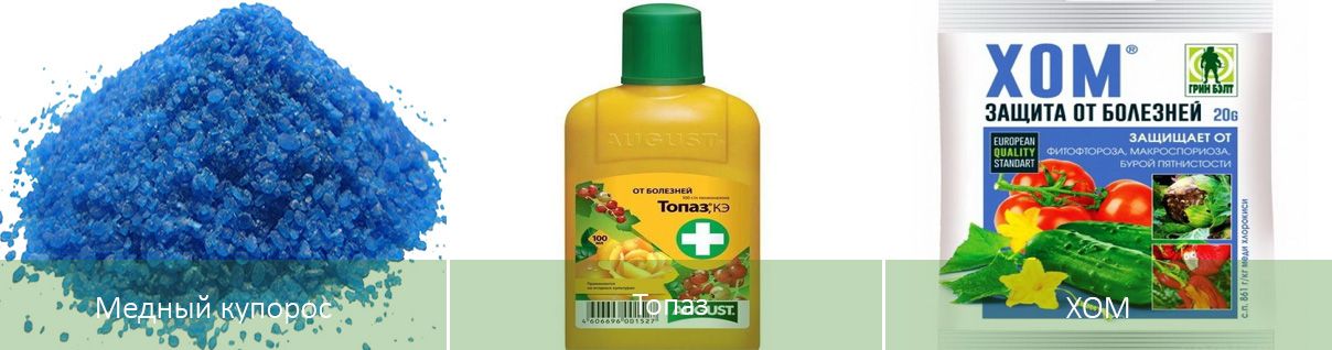 | HOM (алтернатива на бордоската смес) | Разредете 40 г в 10 литра вода. | Използвайте веднъж, преди да се появят цветовете. |