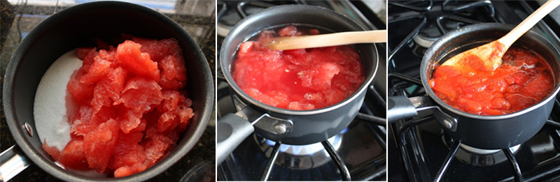 Нарежете ситно билките, добавете захарта и разбъркайте. Изсипете сместа в подготвената пулпа от диня, прецедена през цедка. Разбъркайте отново и оставете да къкри на слаб огън, като бъркате непрекъснато. Когато сместа стане гъста и тъмночервена, лакомството е готово. Изсипете в буркани и затворете.
