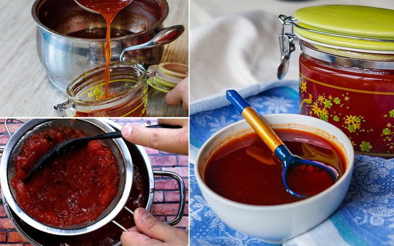 Преди готвене измийте добре плодовете и след това ги разрежете наполовина. Поставете двете половини в голям съд, например чиста купа, и изгребете пулпата с лъжица. Запазете сока, който се отцежда; ще ви е необходим по-късно. След това отстранете семките от пулпата, добавете отцедения сок и го намачкайте на пюре с дървена лъжица. Прецедете получената смес през цедка, за да получите гладка консистенция.