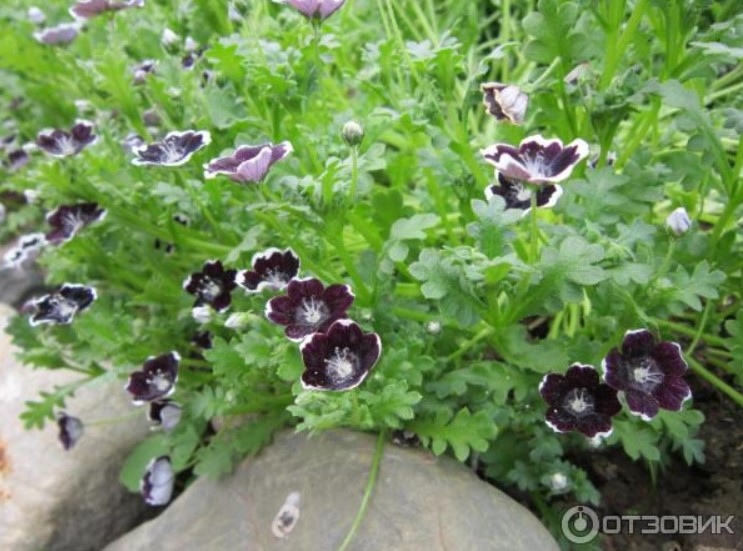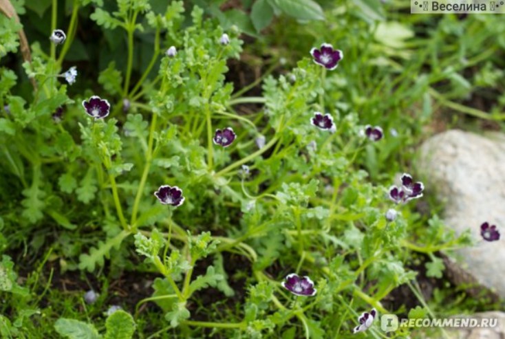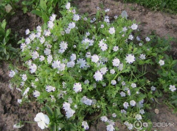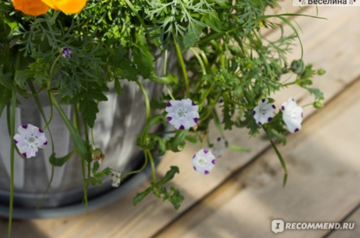 Бих искала да ви разкажа за друго много интересно и лесно за отглеждане цвете - немофилата. Оказва се, че това цвете отговаря на слогана на агрофирмата „Руска градина“. Той гласи: „Немофилата е килим от цветя - няма проблем“. И е вярно. Купих си семена на немофила от тази компания, сортът „Калинка“. Забавно име е, но цветето заслужава името си с причина. Белите венчелистчета изглеждат сякаш нарочно са осеяни с тъмни точки.