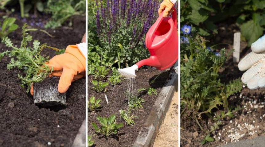 Преди засаждането, изкопайте дупки малко по-дълбоки от кореновата система. Поставете по едно цвете във всяка дупка, покрийте с почва до кореновата шийка и полейте. Препоръчително е да оставите 20 см разстояние между разсада, за да предотвратите пречката между пълзящите издънки. Това също ще им помогне да образуват буен килим.