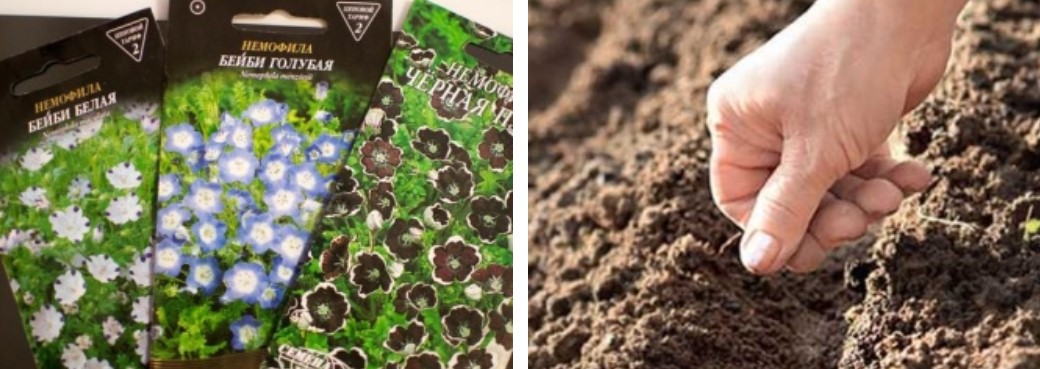Тъй като семената на немофилата са доста малки, те се смесват с пясък за по-лесна работа. Почвата в цветната леха се прекопава, добавя се торф и хумус, добре се навлажнява и се правят бразди с дълбочина до 0,5 см. За да не се объркат култивираните растения с плевели, най-добре е цветята да се засаждат по опъната връв, така че да растат в равни редове. За да се избегне струпване, разстоянието между редовете трябва да е поне 20 см.