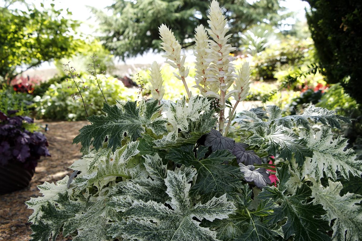 | Тасманийски ангел | „Тасманийският ангел“ е храст, който може да достигне височина от 50 до 70 см. Листата му са едри (30-60 см дълги, 5-15 см широки), украсени с бели ръбове и петна. Цъфти с белезникави пъпки с лилави жилки, образуващи метличести съцветия. Издръжлив е на мраз, но младите храсти трябва да се покриват за зимата. |