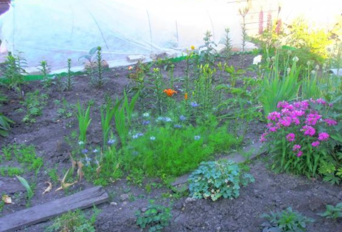 ето цветна леха, ето вече има самозасяващи се гладиоли и лилии