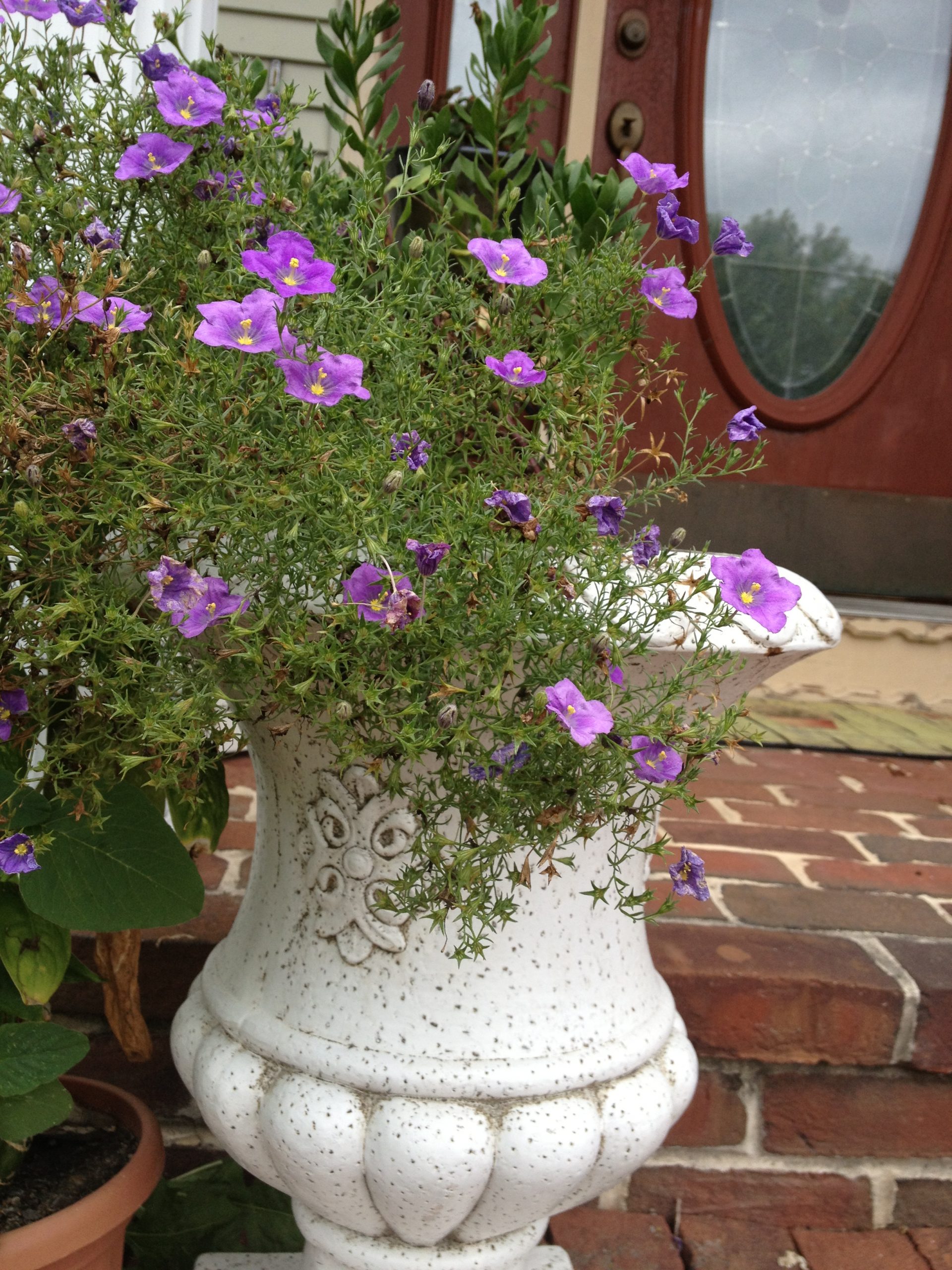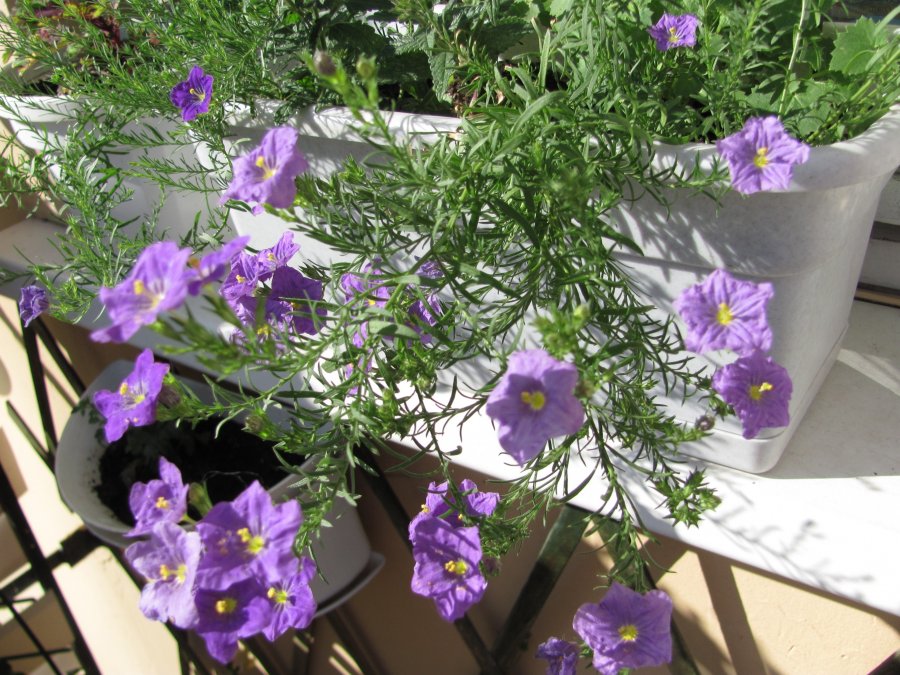 Синя Ниренбергия - Nirenbergia hippomanica. От семейство Паслинови (Solanaceae). Отглежда се като едногодишно растение, но в природата е многогодишно. Затова реших да запазя две растения. Те вече пускат нови издънки, като млада ела. Ще ги размножа под лампи за отглеждане, докато са налични. Ще видя какво ще се случи, преди да ги засадя в земята.