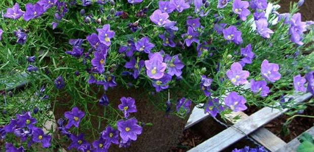 Цветовете са плитки и широко отворени. Цветовете им варират от синьо, синкаво, бяло или лилаво. В началото на лятото пъпките се отварят и цъфтежът продължава три месеца. В края на сезона на мястото на падналите венчелистчета се образува малка двуклапанна капсула, съдържаща множество семена. След като бъдат събрани, тези семена могат да се използват до четири години.