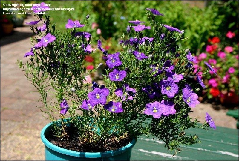 Стъблата са силно разклонени, тънки, високи 30-90 см. Листата са удължени. Цветовете са с диаметър до 2,5 см, прости, със синкаво-лилаво венче и къса жълта тръбичка. Цъфти от юни до септември. Плододава.Даде малко семена и не ги забелязах веднага. Капсулата е микроскопична в сравнение с прилистниците.