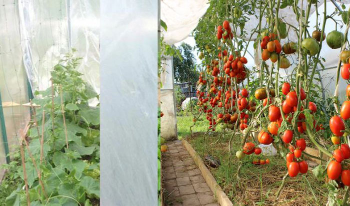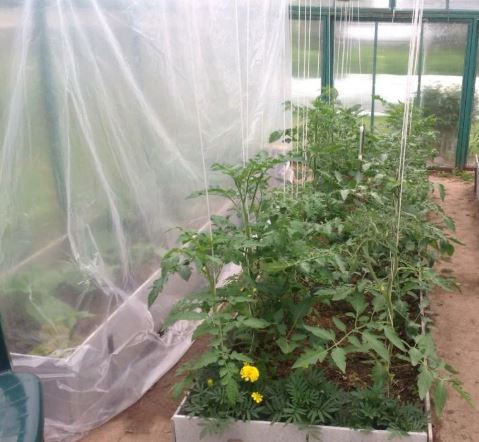 Полиетиленът е опънат от покрива на оранжерията до земята, разделяйки лехите. Всяка секция създава свой собствен микроклимат. Доматите се възползват от редовното проветряване.
