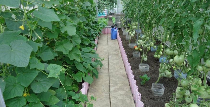 - Използване на вътрешното пространство на оранжерията, като се вземе предвид изборът на взаимно съвместими сортове: домати, устойчиви на гъбични заболявания, и краставици, устойчиви на течение.