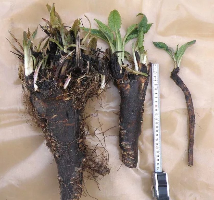 Корените са мощни, основният корен е плътен, черен на цвят, но корените вътре са бели и мазни.