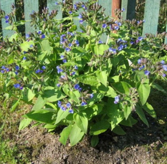 | Многогодишно растение с издънки високи до 150 см. Листата са със сърцевидна или овална форма, дълги до 25 см. Цялата вегетативна повърхност е покрита с гъсти четинки. Цветовете първоначално са светлолилави, по-късно стават сини. | Расте в цяла Европа и се среща по ливади и пустоши. | Чрез семена и разделяне на корените. | Листата се използват като храна за добитък, а изсушеният корен се използва за приготвяне на тинктури, които помагат при язви, тромбофлебит и рани. Цветовете привличат пчелите и могат да служат като източник на нектар, след което се косят и компостират. |