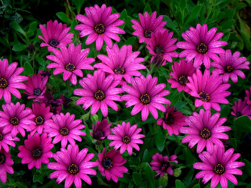 Размерът им варира от 2,5 до 7,5 см и се виждат отворени само при слънчево време, предпазвайки полена им. Остеоспермумът може да забави или дори да спре растежа си през летните жеги; избягвайте обаче преполиване или третиране на растението. Тази реакция е естествена и ще отшуми сама, след като температурите се нормализират.