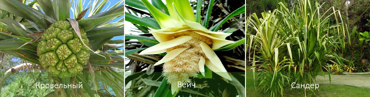 | Вейч | Най-разпространеният вид, счита се за пъстролистно растение. Достига до 2 м височина. Краищата на листата имат остри бодли. Има късо стъбло, от което се простират въздушни корени. Листата са тъмнозелени, с бели или жълти надлъжни ивици по върховете. |