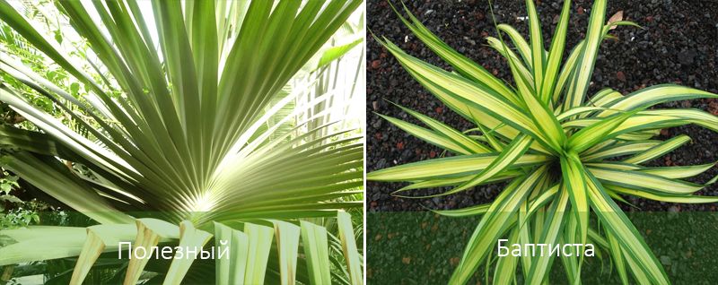 | Местоположение/осветление | Прозорци с югоизточно и източно изложение. За да се осигури равномерно развитие на листата, палмата понякога се обръща така, че задната ѝ страна да е обърната към светлината. Панданусът предпочита ярка, но индиректна светлина и не понася пряка слънчева светлина. | Поставете близо до прозорец с южно изложение. Необходимо е допълнително осветление; използват се специални флуоресцентни лампи. |