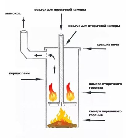 Печка от този тип се състои от просторна горивна камера, камера за допълнително горене, комин, оборудван с амортисьор, и конвектор, изработен от извити тръби.