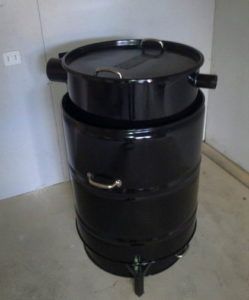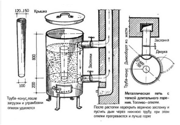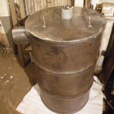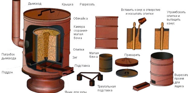 По време на работа дървата за огрев или дървените стърготини в горивната камера тлеят и падат под натиска на капака. След като пепелта достигне дъното, бъчвата се почиства от пепелта и се добавя нова порция гориво, достатъчна за отопление в продължение на 8-24 часа.