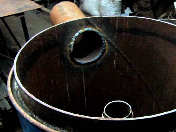 - Тръбата е заварена към отвора в цевта, предназначен за комина. Конструкцията за отвеждане на дим трябва да е с дължина най-малко 5 метра.