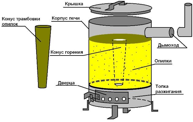 За зареждане на дървени стърготини се използва стоманен конус. Препоръчително е диаметърът му да е 15 см отгоре и 7-8 см отдолу. След като пещта се напълни, конусът се отстранява.