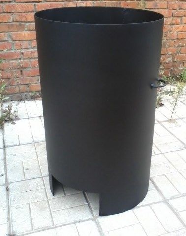 - Монтирайте коминна тръба в горната част на 1 варел и изрежете кръг с диаметър 10 см в долната част.
