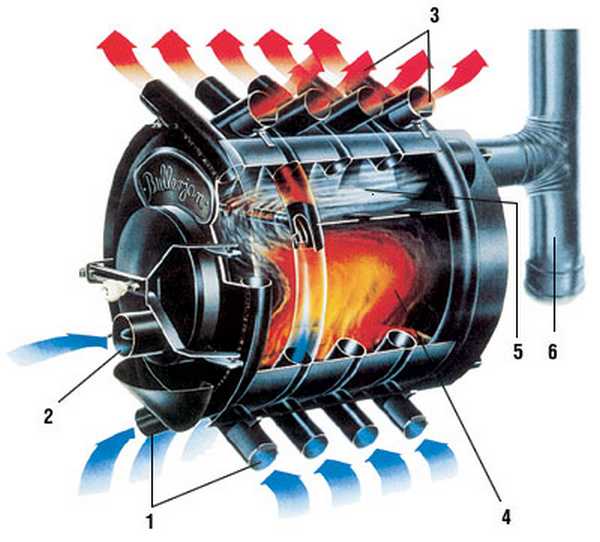 Печката съдържа топлообменни тръби, вратичка за добавяне на гориво, димоотводна клапа и регулатор на тягата.