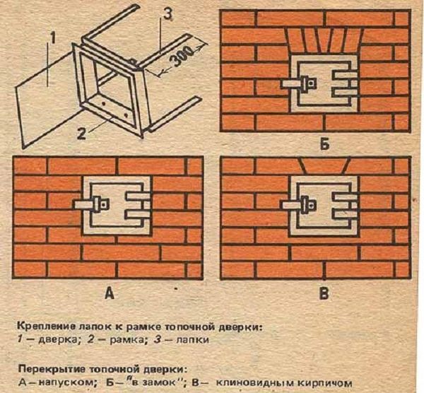 - За първите четири реда е необходима червена тухла. Като свързващо вещество се използва глинен разтвор. Монтира се чугунена врата за пепелник.