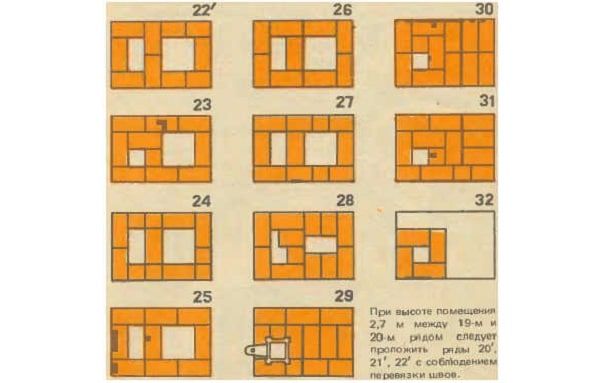 - Редове 13-15 са направени от огнеупорни тухли, като редове 14-15 са предназначени за тавана на трезора. Препоръчително е да се монтира по една врата за почистване в редове 15 и 16. От ред 16 нататък се използва обикновена тухла.
