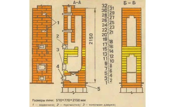 - Редове от 5 до 12 са направени от огнеупорни тухли, залепени с топлоустойчив хоросан. Решетката е монтирана в ред 5, а вратата на горивната камера е монтирана в редове от 6 до 8.