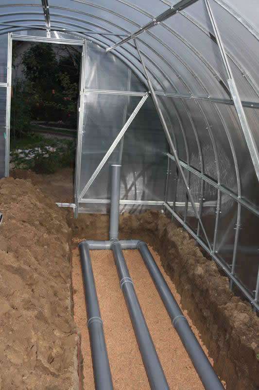 Предпочитаното място за тръбите е по периметъра на оранжерията. Това осигурява равномерно разпределение на топлината в оранжерията, неутрализирайки студения въздух от периферията. Предвид специфичните нужди на отглежданите растения, тръбите се поставят под слой почва или бетон.