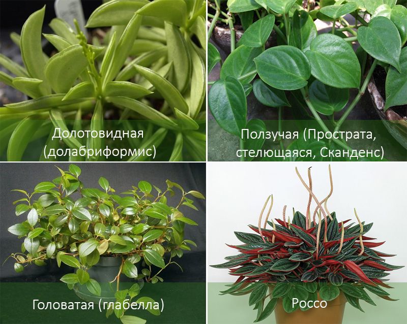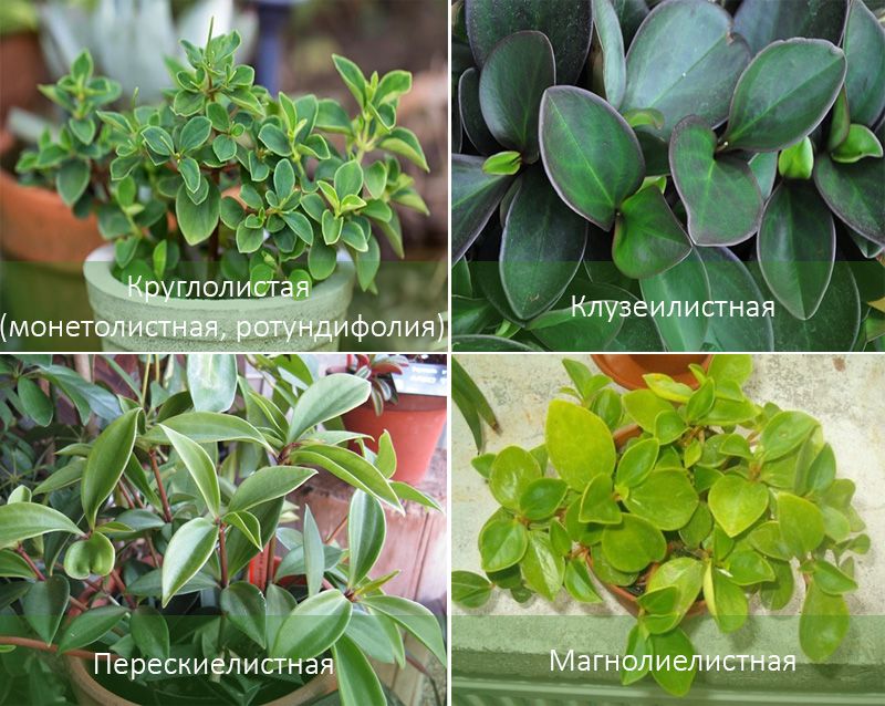 | Кръглолистна (монетолистна, rotundifolia) | Пълзящ, дребнолист вид. Пълзящите, светлокафяви издънки са покрити с малки, кръгли, яркозелени листа. Този вид няма период на покой в своя цикъл. |