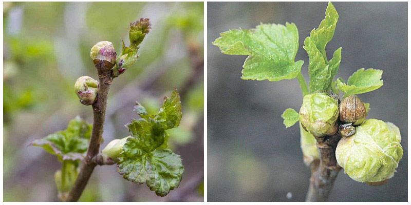 Пъпките, заразени от акара, набъбват, приличайки на рошава глава зеле. Те съдържат хиляди женски, готови да снесат яйца през пролетта.