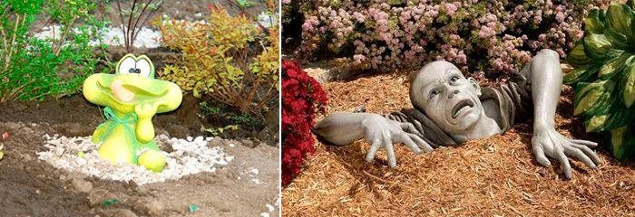 Можете да създадете „потъващи“ фигури, което означава, че тези скулптури „изплуват“ от земята. Костенурка, гъба, саксия или други предмети, украсени с мозайки, също биха изглеждали привлекателно. Всички тези идеи от цимент могат да бъдат реализирани с помощта на гипс.