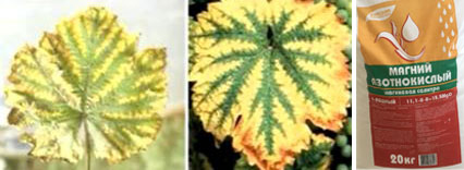 | Магнезий | Пожълтяване по централната жилка на листа.