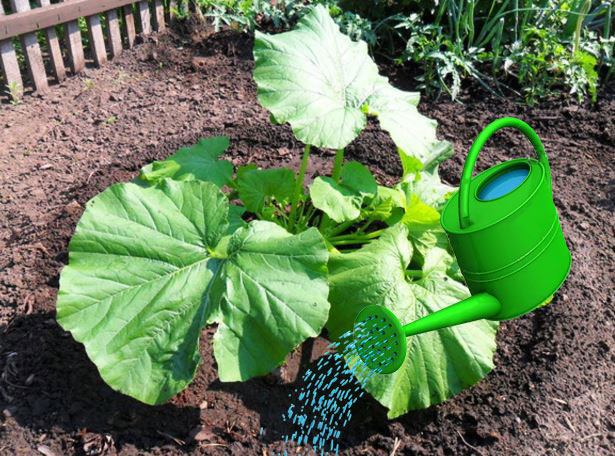 Ако външната температура не е твърде висока, поливайте както обикновено с лейка или маркуч. Ако почвата е достатъчно влажна, количеството използвана вода може да се намали. Тогава тиквата абсорбира по-добре влагата и разтворените хранителни вещества от почвата.