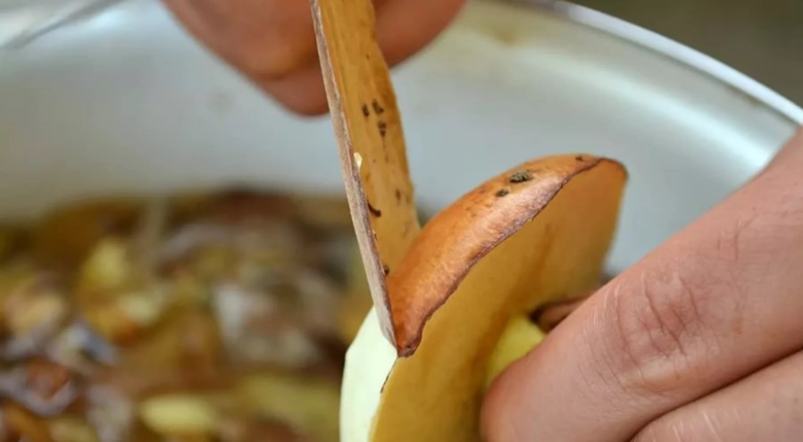 - С нож отворете капачката и внимателно отлепете кожата от единия до другия край. За да улесните процеса, опитните гъбари препоръчват да потопите капачката в растително масло.