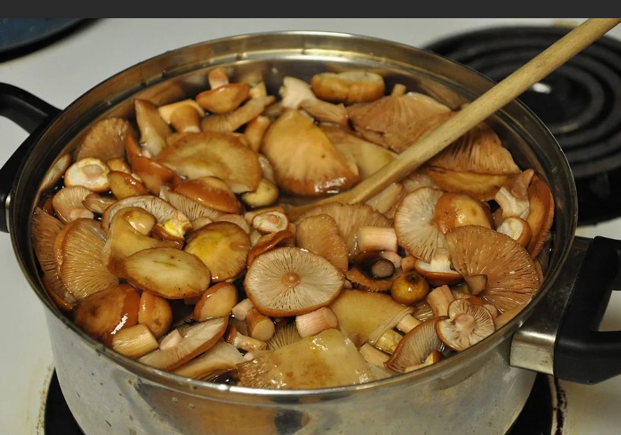 - Гъбите се почистват и се варят 30 минути със сол и подправки.
