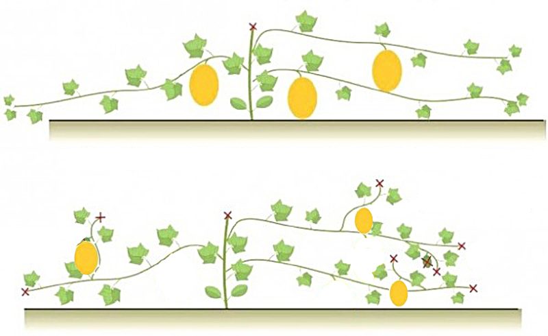 Централният издънка на динята също трябва да се прищипе. Това обикновено се прави над 3-тия или 4-тия лист. Страничните издънки трябва да се прегледат внимателно и да се запазят двата най-силни. Те също трябва да се прищипнат, като се прави това над 5-тия или 6-тия лист.
