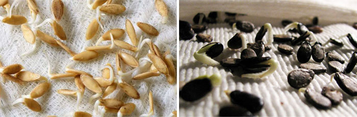 Първо, семената трябва да се накиснат. Първо, те трябва да се сортират по сорт, след което да се увият в няколко слоя тензух. Цялата опаковка се поставя в съд с малко количество вода на дъното. Семената се накисват, докато се появят първите кълнове.